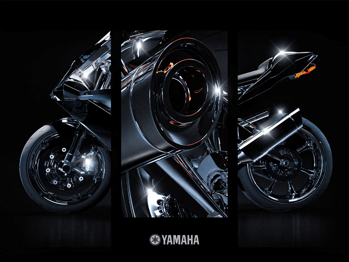 Pour l’affichage de la Yamaha R9, j’ai créé deux versions distinctes : une qui dévoile l’intégralité de la moto, permettant d’apprécier son design global, et une version triptyque focalisée sur les détails. Cette approche me permet de trouver un équilibre entre une vue d’ensemble captivante et une exploration plus intime des courbes, des textures et des reflets, afin de mettre en avant l’aspect artistique de la R9 de manière subtile et esthétique.