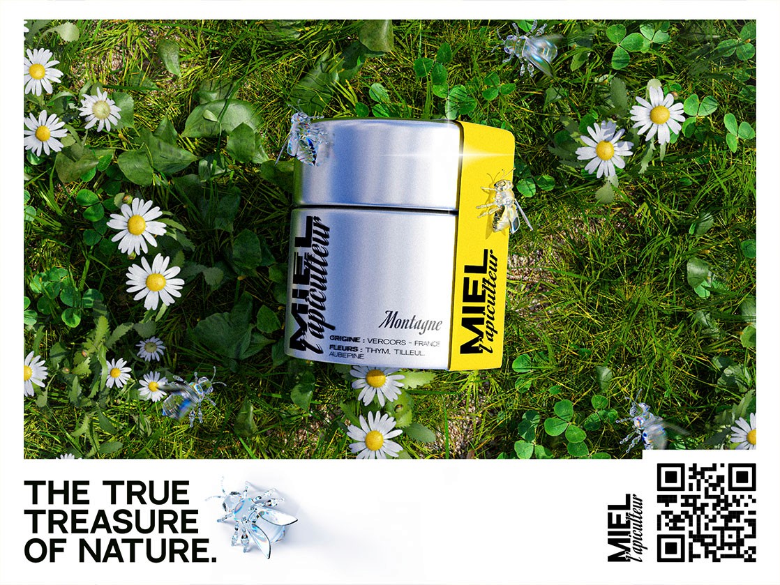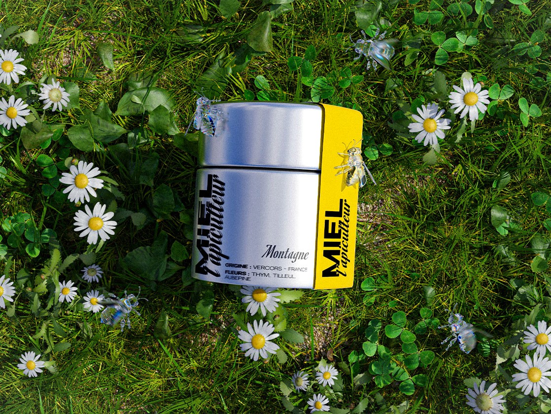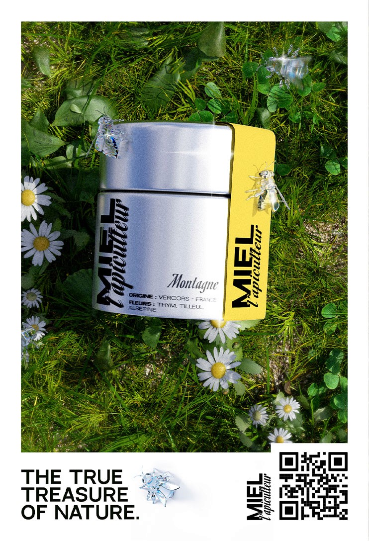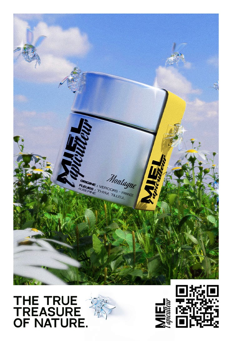 Le miel est un bien précieux, fruit du travail acharné des abeilles et véritable trésor de la nature. La nouvelle gamme de Miel l’Apiculteur mettra en valeur cette richesse en s’inspirant des matériaux précieux comme l’argent et le diamant. Les pots seront argentés, reflétant l’élégance et la pureté du miel, tandis que les abeilles seront représentées en diamant, symbolisant leur rôle essentiel dans la pollinisation. L’objectif est de présenter le miel français comme un produit précieux et unique.